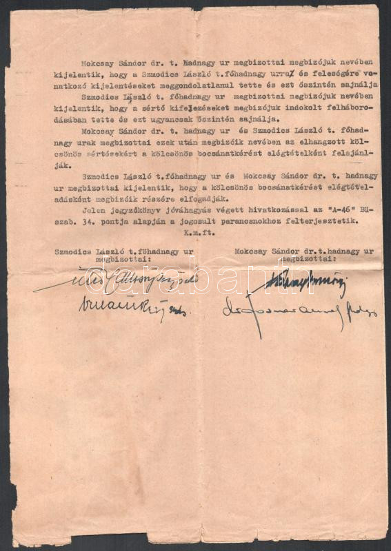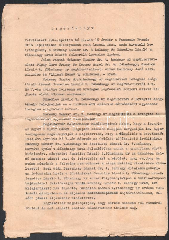 1944 Lovagias ügy jegyzőkönyve, Szmodics László t. főhadnagy és dr. Mokcsay Sándor t. hadnagy között (utóbbi az előbbit azzal vádolta, hogy "üzemében zsidó csendes társat tart", valamint felvetette hogy "ha utánanéznének, a felesége nem volna-e a sárga csillag viselésére kötelezett?"), másfél gépelt oldal, a felek megbízottjainak aláírásaival, lapszéli sérülésekkel
