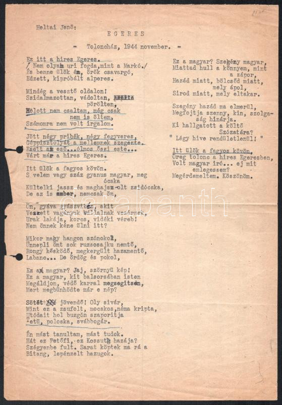 1944 Toloncház, Heltai Jenő: Egeres című vers gépirata, hajtott