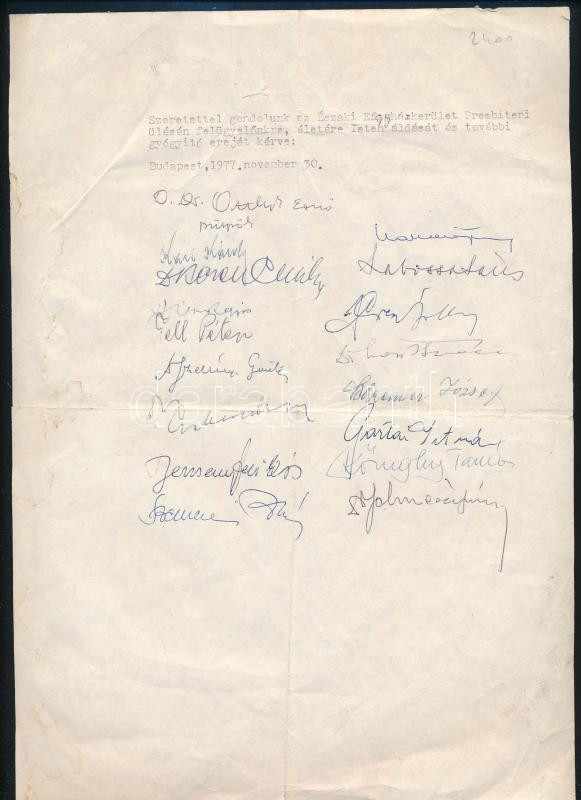 Description: 1977 Bp., Északi (Evangélikus) Egyházkerület Presbiteri ülésének emléklapja, rajta össz. 17 db aláírással: Dr. Ottlik Ernő püspök, Gartai István, Kőszeghy Tamás, stb. Lapszéli folttal.
