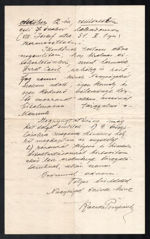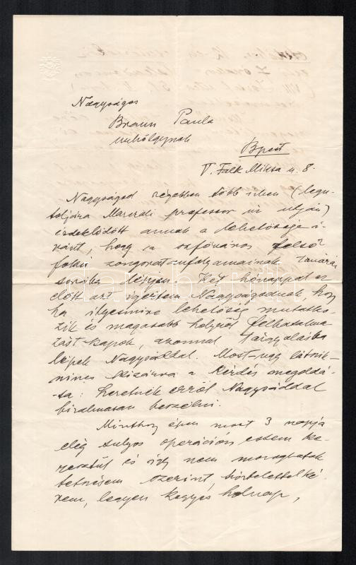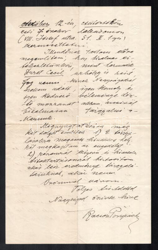 cca 1910 Kacsóh Pongrácz (1873-1923) zeneszerző autográf levele Braun Paula (1881-1962) zongoraművésznőnek. A levélben a székesfővárosi zongoratanfolyam tanárának jelentkező Braunnal tudatja, hogy most lehet alkalmas a belépése és ennek ügyében lakására hívja, de egyben jelzi, hogy egy másik jelentkezőt Duret Cecilt is meghallhat az ügyben. Két beírt oldal