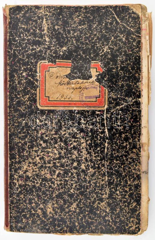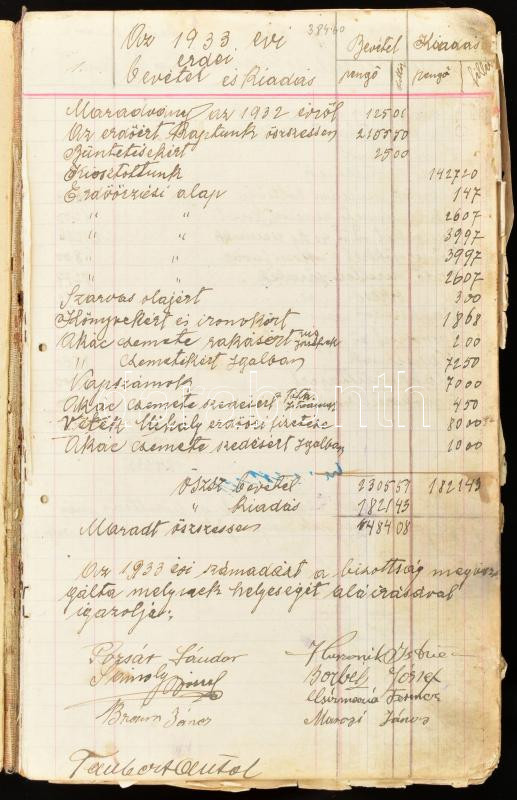 cca 1933-1960 Somogyszil Erdőbirtokosság (erdőgazdaság) naplója a közbirtokosok bevételeiről és kiadásairól, számos bejegyzéssel, korabeli félvászon kötésben, sérült kötéssel, lapok egy része kijár, részben sérült és foltos lapokkal, mellékelve néhány további okmány az 1957-1960 körüli időszakból valamint egy régi csoportkép gyerekekkel, fotó Stegmüller/Szombathely, kissé sérült és foltos