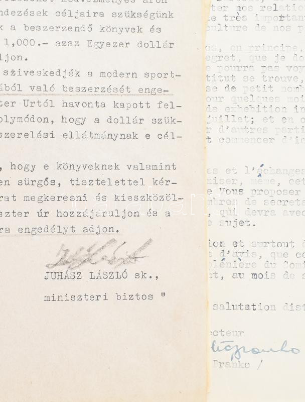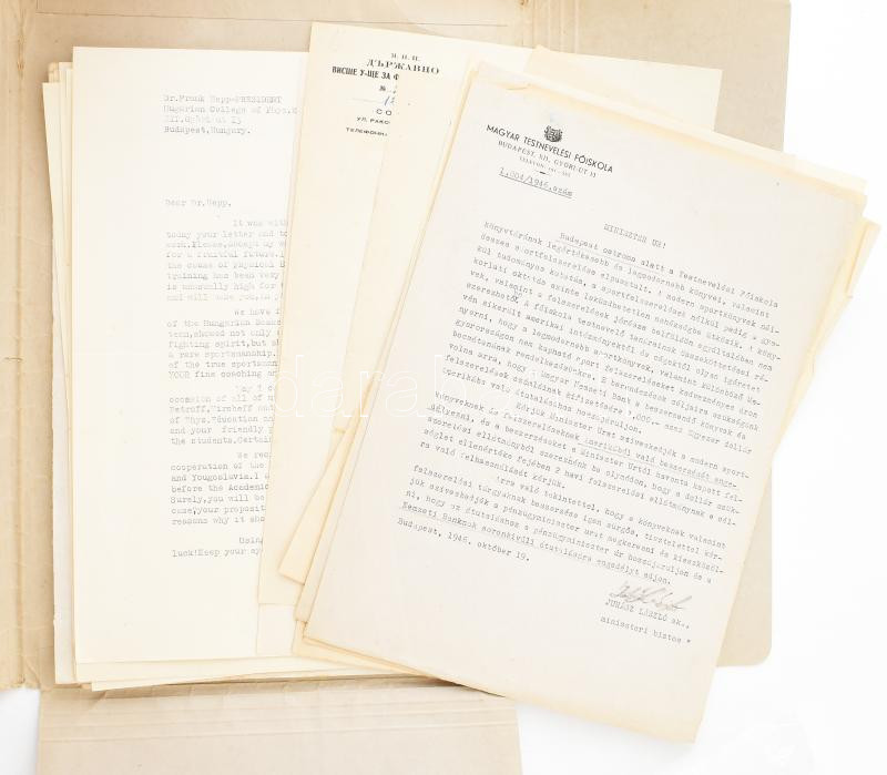 Description: cca 1946-48 A budapesti Testnevelési Főiskola II. világháborús ostrom alatt elpusztult könyvei és sportfelszerelése ügyében folytatott valamint 1947-48-as Balkáni Játékok ügyében folytatott levelezés, közte néhány Hepp Ferenc (1909-1980) sportvezető, a TF főigazgatója aláírásaival, össz. kb. 25 db