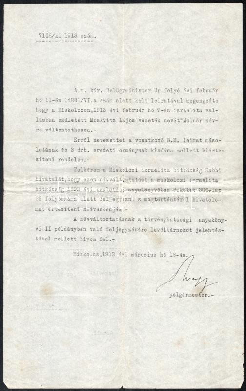 Description: 1913 Miskolc, névváltoztatási kérelem jóváhagyása Moskovitz Lajos részére, vezetéknevének Molnár-ra történő változtatásáról, Miskolc polgármesterének, Dr. Nagy Ferencnek aláírásával