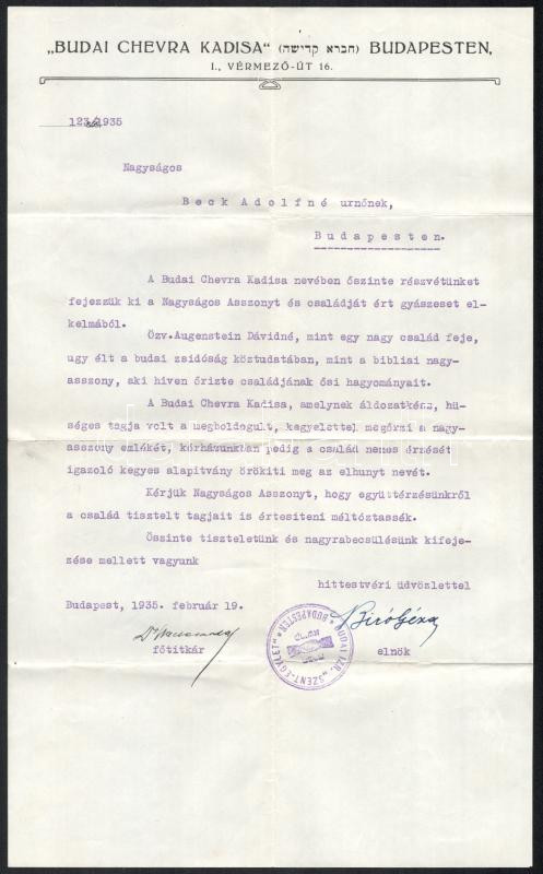 https://www.darabanth.com/en/457-Online-auction/457.0/Art-and-other-collectibles/Judaica~1500004/1935-Ozv-Augenstein-Davidne-elhunyta-alkalmabol-kuldott-reszvetnyilvanitas-a-Budai-Chev~II3025192