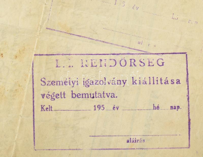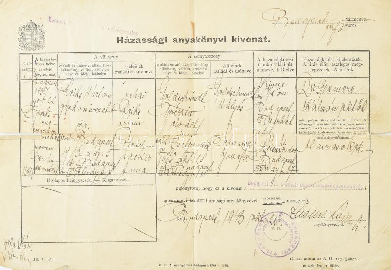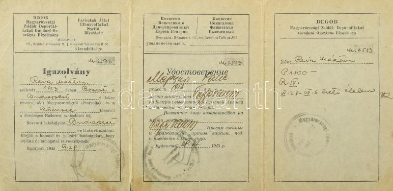 1943-1971 Reisz Márton (1913-1971) házassági anyakönyvi kivonata, DEGOB (Magyarországi Zsidókat Gondozó Országos Bizottsága) igazolványa, benne két munkaszolgálatosokat ábrázoló viseltes fotóval, valamint igazolvány (Ausweis/Certification) arról, hogy a mauthauseni koncentrációs tábor foglya volt, valamint a halotti anyakönyvi kivonata. Változó állapotban, közte javított, és szakadt is.