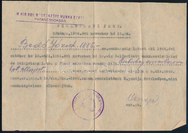 1944 Kőbánya, A m. kir. 801. rögtönzött munka ezred szolgálati jegye B...