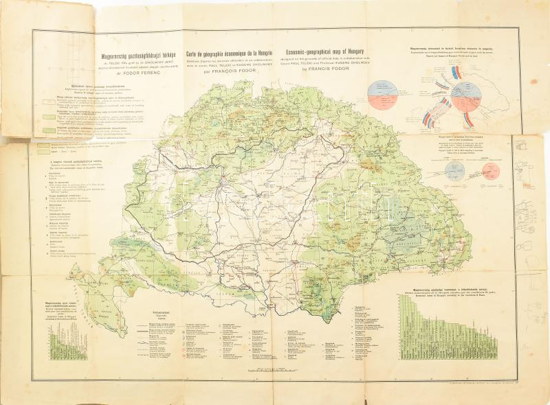 1920 Magyarország gazdaságföldrajzi térképe dr. Teleki Pál gróf és dr. Cholnoky Jenő közreműködésével hivatalos adatok alapján szerk. dr. Fodor Ferenc, 1:1.500.000, Bp., M. Kir. Földrajzi Intézet, sérült, erősen szakadt, foltos, lapszéli firkával, 63x85 cm