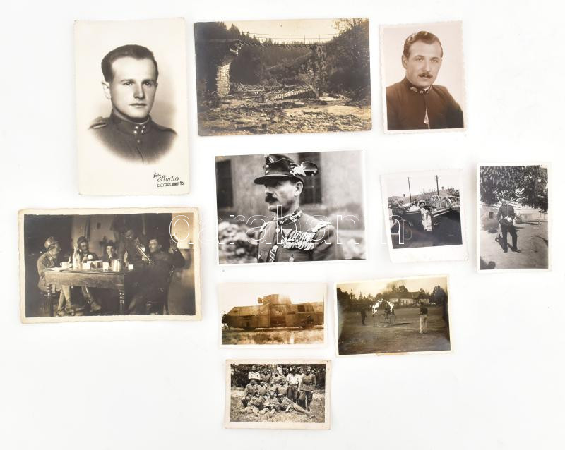 10 db katonai fotó, közte I. és II. világháború, páncélvonat Oroszországban, katonai esküvő, mulatozó katonák, lerombolt híd a fronton, stb. Vegyes állapotban, részben feliratozva, 13,5x8,5 cm és 7x5,5 cm között