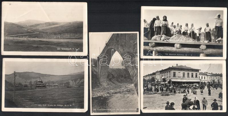 1915 I. világháborús felvételek a keleti frontról (mai Ukrajna területe): Kolomija; építkezésen dolgozó asszonyok; híd a Prut folyón Jaremcse környékén; Tatár-hágó; ortodox templom Deljatin közelében. 5 db eredeti fotó, 14,5x9 cm körüli méretben. / 1915 WWI photos from the Eastern Front (Ukraine): Kolomyia (Kolomea); women working in construction; bridge on the Prut river near Yaremche; mountain pass (Tatarenpass); Orthodox church around Deliatyn. 5 original photos, around 14.5x9 cm.