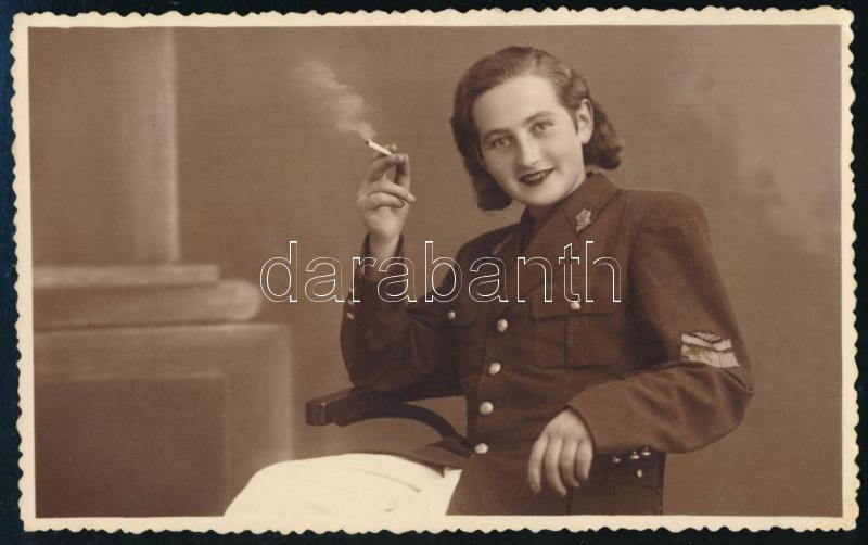 1938 Dohányzó hölgy katonai ruhában, hátoldalon feliratozott fotólap, ...