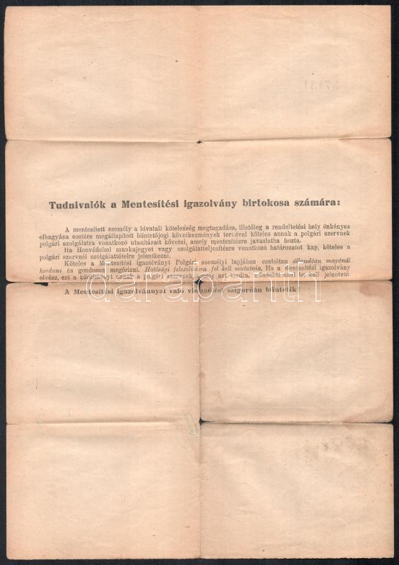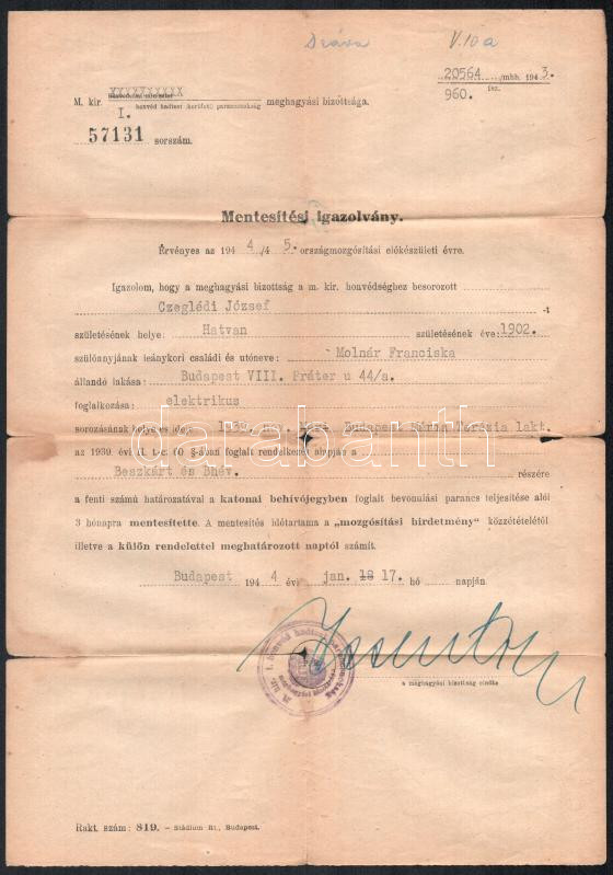 1944 mentesítési igazolvány, érvényes az 1944/45. országmozgosítási el... https://www.darabanth.com/en/457-Online-auction/457.0/Art-and-other-collectibles/Military~1500011/1944-mentesitesi-igazolvany-ervenyes-az-194445-orszagmozgositasi-elokeszuleti-evre-B~II3033473
