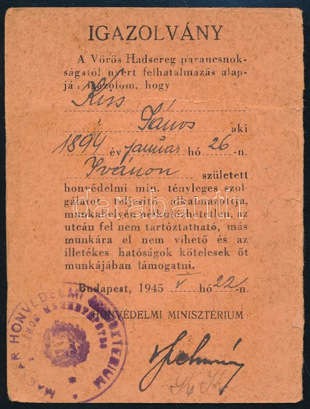 https://www.darabanth.com/en/457-Online-auction/457.0/Art-and-other-collectibles/Military~1500011/1945V22-Fenykepes-igazolvany-Honvedelmi-Miniszterium-alkalmazottja-reszere-szakadassal~II3060248