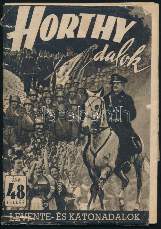 Description: Horthy dalok, kormányzó úr őfőméltósága 73-ik névnapjára. 73 magyar népi dal. Bp., 1914, Magyar Népművelők Társasága. Rendkívül gazdag katonai képanyaggal illusztrált levente és katonadalok füzete. Tűzött papírkötésben, sérült és részben javított borítóval, könyvtest elvált a borítótól, címlapon kisebb sérüléssel ritka, 94p