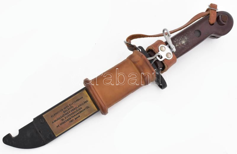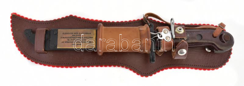 Magyar AK-63 bajonett, eredeti hüvellyel, rajta ajándékozási plakettel: "Klenovics Imre elvtársnak emlékül a Munkásőrség megalakulása 30. évfordulóján az országos parancsnoktól, 1987. január". Falra akasztható díszes tartóban, h: 33 cm. (Klenovics Imre (1928-2006) kommunista politikus, az MSZMP Somogy megyei pártbizottságának tagja, 1985 és 1989 között az MSZMP Központi Bizottságának tagja).