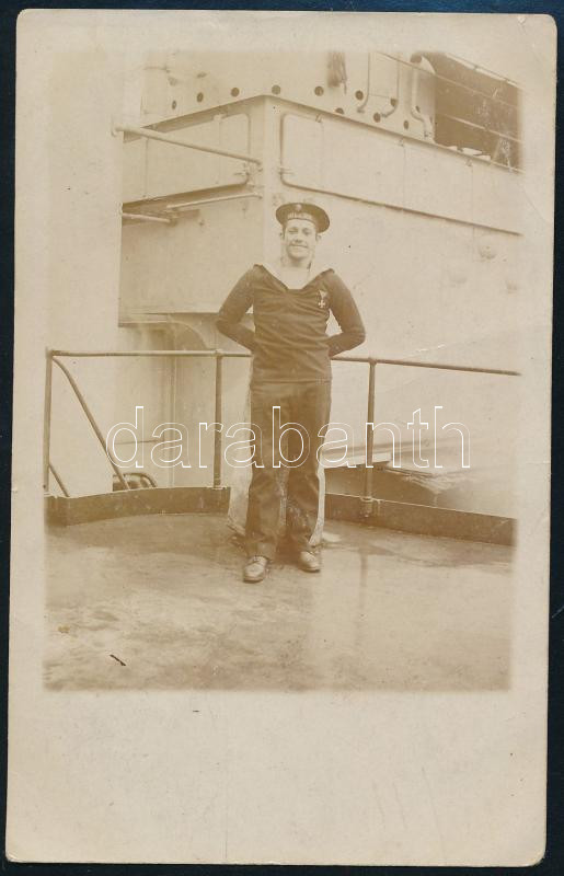 Description: cca 1916 Az S.M.S. Babenberg osztrák-magyar Habsburg-osztályú pre-dreadnought csatahajó (Linienschiff) matróza fotólap hátoldalán hajópecséttel és felírással / Navy sailor of the S.M.S. Babenberg photo postcard with ship seal