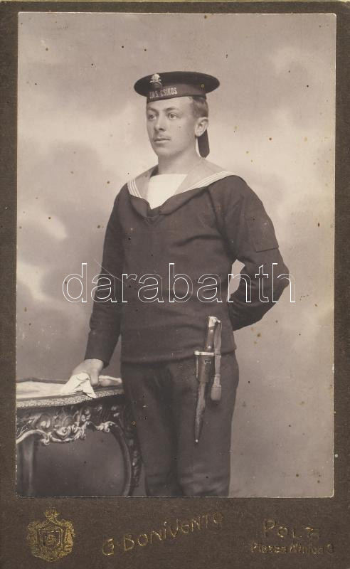 Description: cca 1916 Az osztrák-magyar haditengerészet S.M.S. Csikós hajóján szolgáló matróz nevesített fotója / Studio photograph of a young seaman named Schmid serving on S.M.S. Csikos. The photographer was Giovanni Bonivento, in Pola, 10.5 cm x 6.5 cm