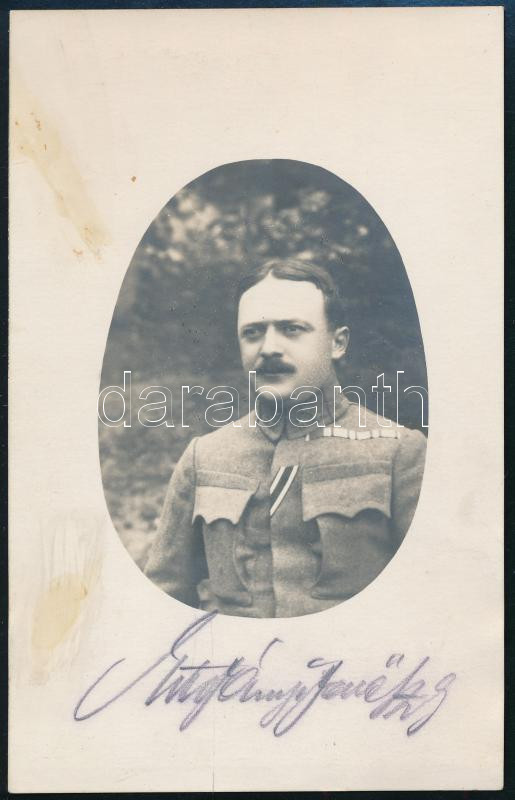 cca 1918 Estefányi Jenő (1883. Kassa - ?), a 16. honvéd gyalogezred századosa, a Vaskorona Rend III. osztálya, Katonai Érdemkereszt II. osztálya, Signum Laudis, ill. Vaskereszt tulajdonosának portréja (saját kezű? aláírással); fotólap, a hátoldalon feliratozva, 14x8,5 cm. Estefányi Jenő a Budapesti Katonatanács (1918. okt.-1919. ápr.) alapító tagja, a Tisza-gyilkosság egyik kihallgatottja volt; 1946. augusztusában századosi rendfokozatban került nyugállományba.