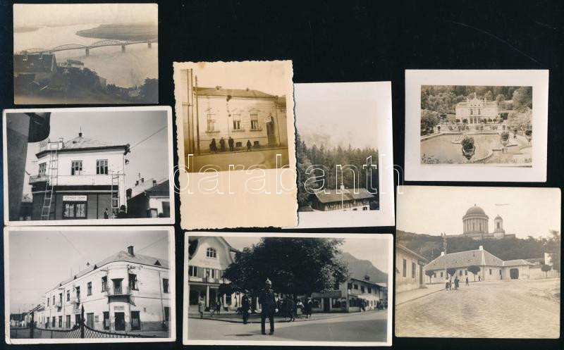 cca 1920-42 vegyes fotó tétel, össz. 7 db, közte Aradi utcarészlet Illyés cégérrel; Huszti utcarészlet Rosenbaum Herman üzletével; esztergomi részletek, egyik látkép a Mária Valéria hÃddal; Schloss Linderhof, Bajororoszág, utcarészlet Oberammergauban közlekedési rendÅ‘rrel s stb. 5x7 és 6x8,5 cm közötti méretekben