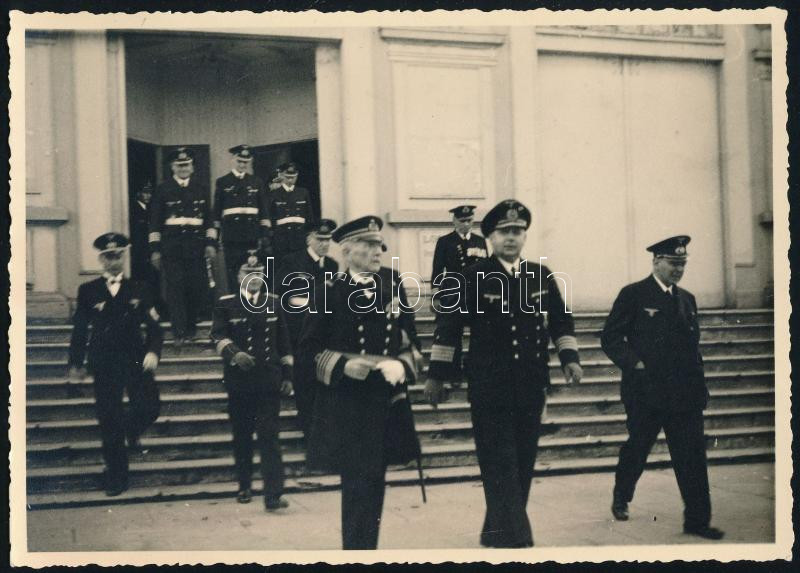 cca 1940 A III. Birodalom haditengerészetének, emlékünnepsége az osztrák-magyar haditengerészet és a német császári haditengerészetről, a távozó Adolf Schmidt sorhajókapitány és Helmuth Brinkmann (1895-1983) kapitány / ca 1940. Linienschiffskapitän Adolf Schmidt and Kapitän zur See Helmuth Brinkmann step out of the venue where the Tradition ceremonies of the Third Reich navy for the German Imperial Navy and the Austro-Hungarian k.u.k. Kriegsmarine 18x12,5 cm