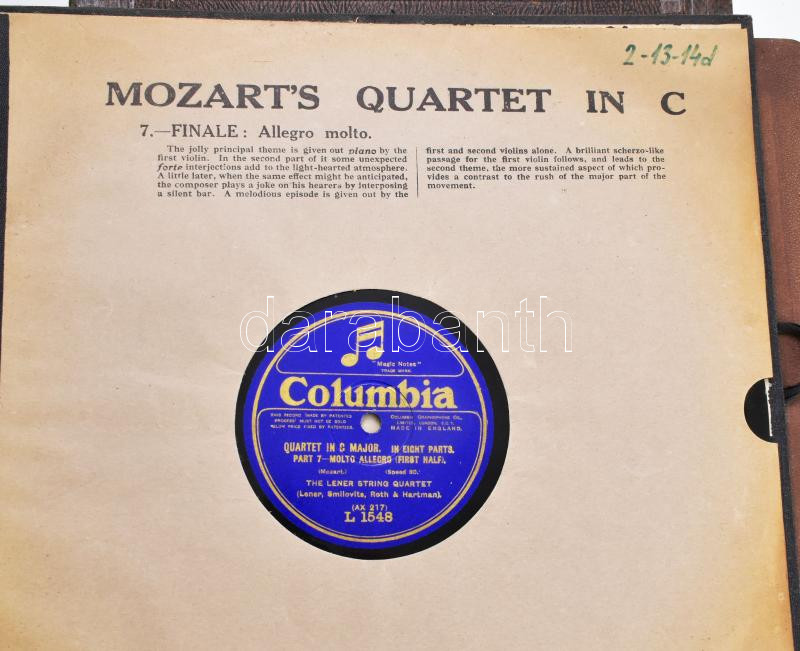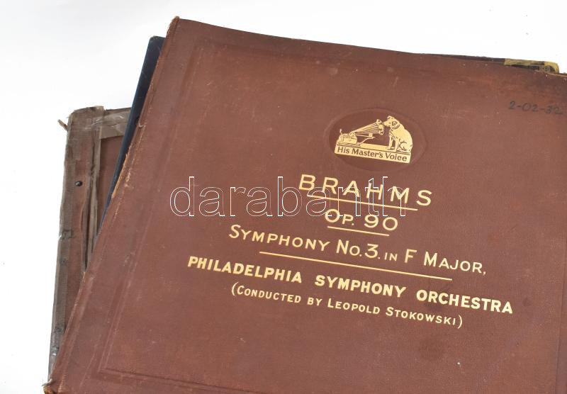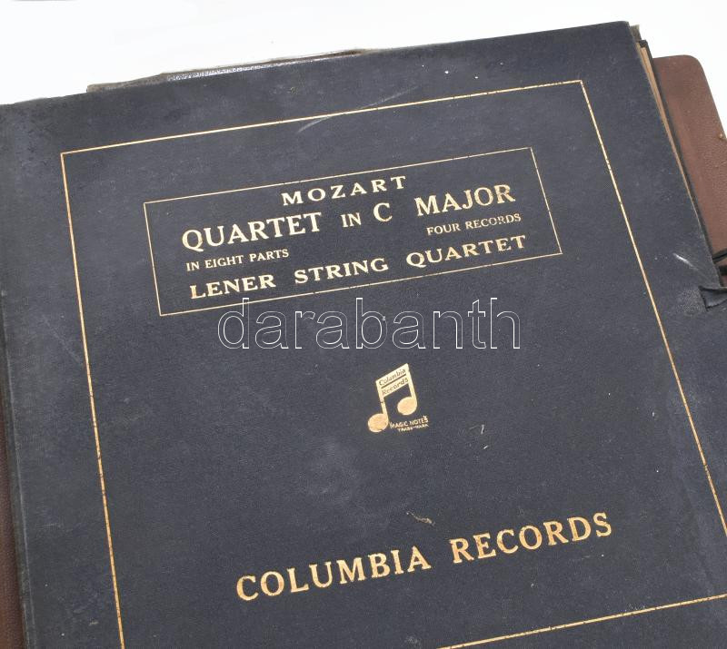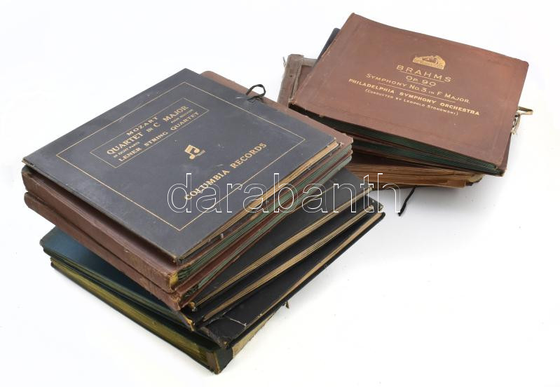 cca 1930 nagy gramofon lemez gyűjtemény, közel 100 db, Schubert, Mozart, Beethoven, Brahms stb., nagy többségben komplett zeneművek, klf. kiadók (Columbia, His Master's Voice stb.), korabeli aranyozott vászonkötésű, részben sérült, kiadói albumokban.
