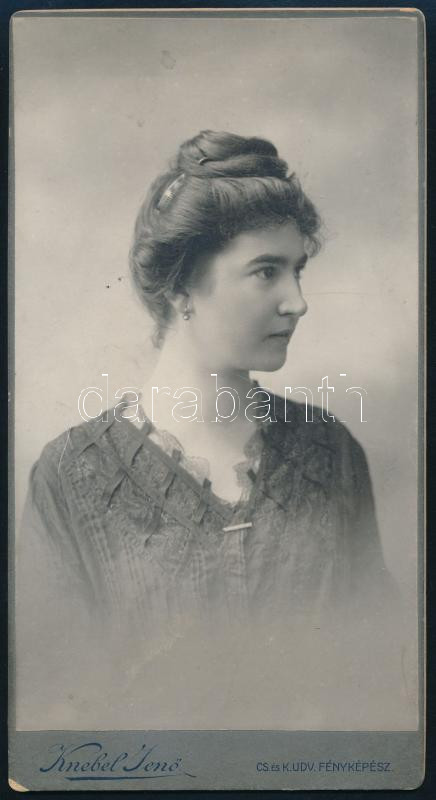 Description: 1905 Tessényi Margit (1879-1957) zongoraművésznő dedikált portréfotója, P. Szathmáry Gizella részére dedikált, keményhátú fotó Knebel Jenő szombathelyi műterméből, 20x11 cm