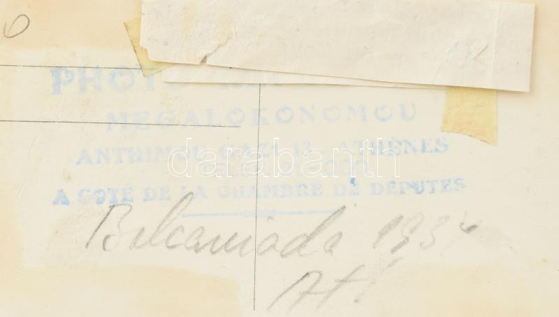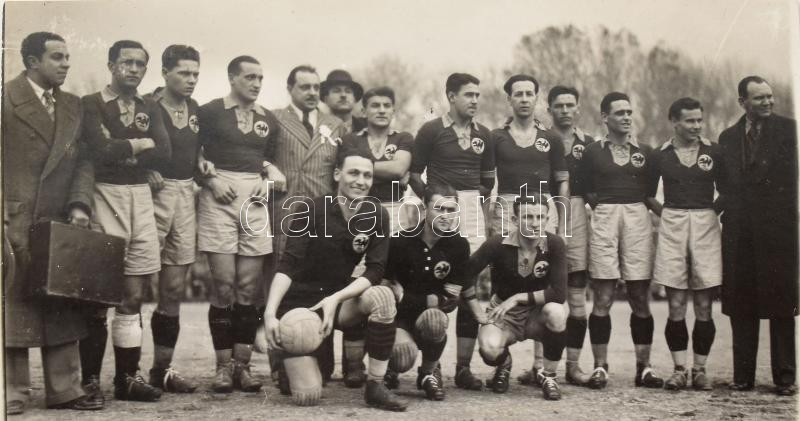 1934 A román labdarúgó válogatott tagjai a Balcaniada játékokon, ahol 3. helyezést értek el. Ciolac, Albu, Dobay, Juhász, Munteanu, Lent, Kovács, stb / members of the Romanian national football team at the Balcaniada Games, where they achieved 3rd place 11x6 cm