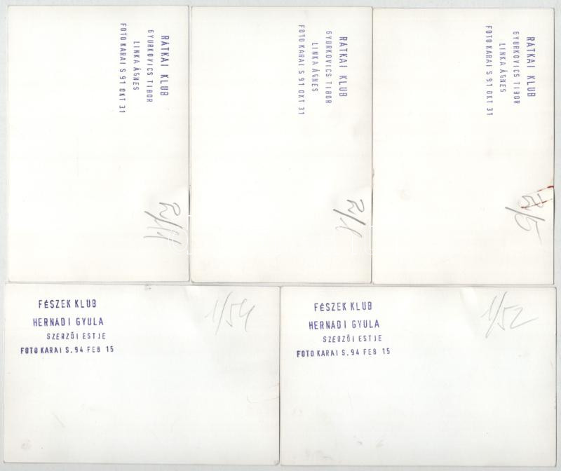 1991 Rátkai Klub, Gyurkovics Tibor költő (3 db) + 1994 Fészek Klub, Hernádi Gyula szerzői estje (2 db), össz. 5 db jelzett sajtófotó, 14x9 cm
