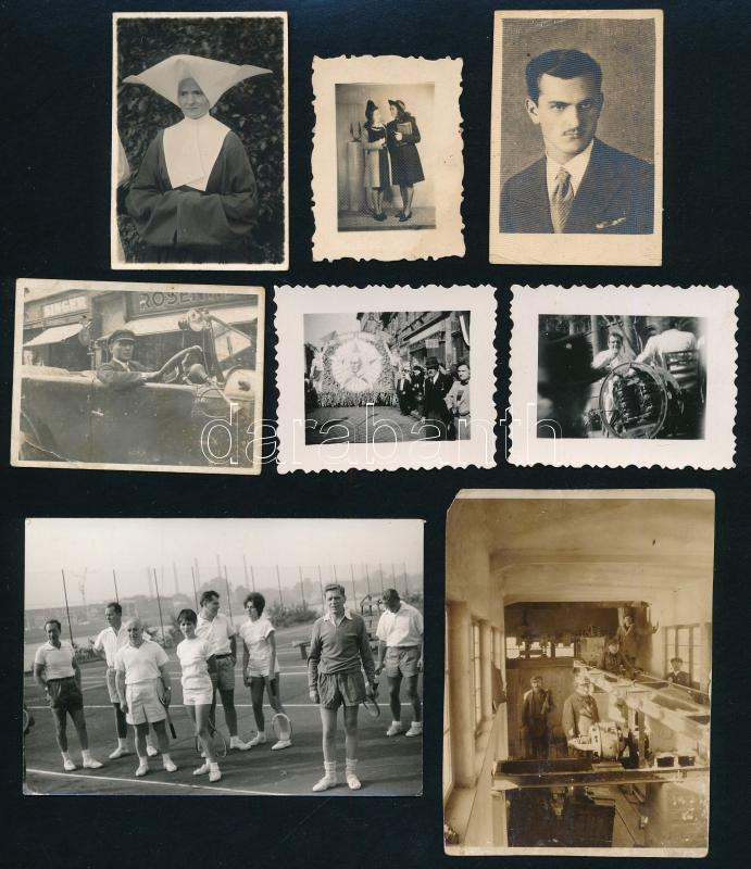 8 db vegyes régi fotó: férfi automobilban, apáca, elegáns hölgyek, gyári munkások, teniszezők, stb.; vegyes állapotban, 4,5x3,5 cm és 9,5x6,5 cm között