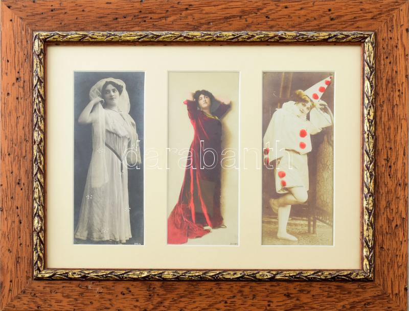 Három grácia. Részben színezett fotók, 1900-1920 körül. Jelzés nélkül. Üvegezett fakeretben. modern paszpartuban. 16x6,5x3 cm.