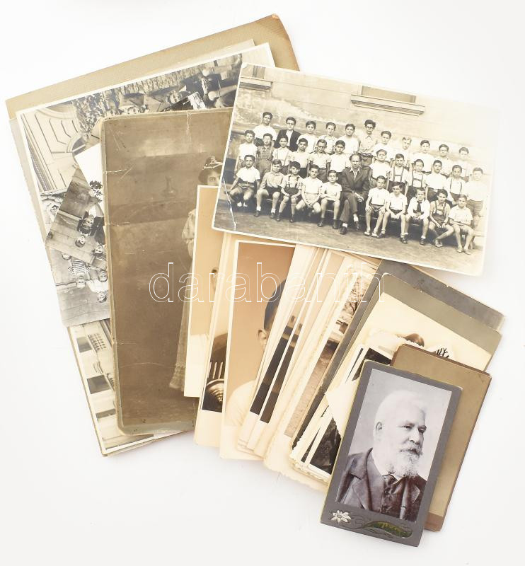 cca 1900-1975 Vegyes fotó tétel, közte vizitkártyák, gyerekportrék, iskolai csoportképek, stb., összesen kb. 40-50 db