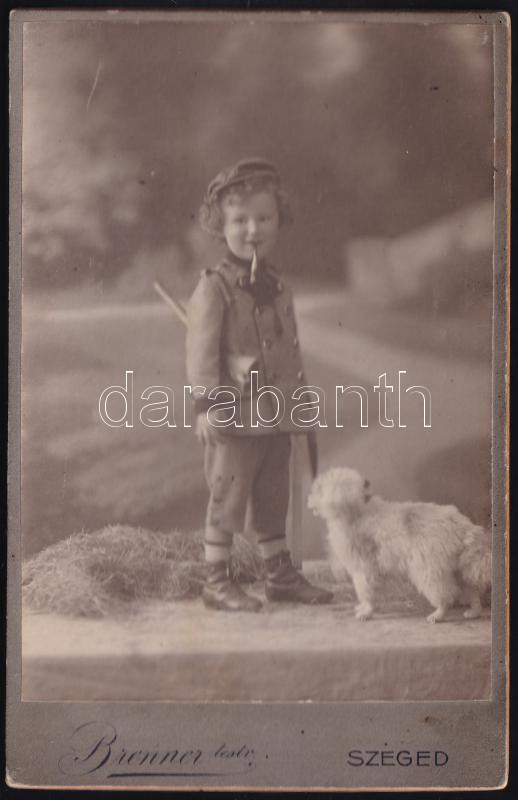 Description: cca 1900 Vadásznak öltözött kisfiú, kutyával, játékpuskával, szájában pipával; keményhátú kabinetfotó a Brenner Testvérek szegedi műterméből, 16,5x10,5 cm