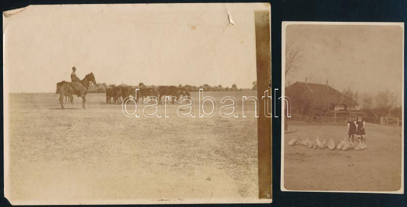 cca 1910-1920 Falusi, pusztai életképek, 2 db fotó, sérülésekkel, 10×7 és 12×16 cm