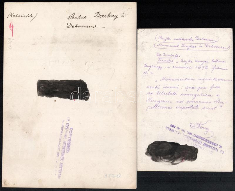Description: cca 1920-1930 Debreceni Ruyter emlékoszlop, Bocskay-szobor, 2 db hátoldalon feliratozott, retusált fotó Kerny István aláírásával és az amszterdami fotóügynökség pecsétjével, 23×16 és 17,5×11,5 cm