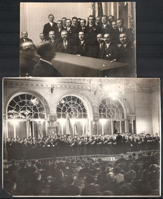 Description: cca 1930-40 BSzKRT (Beszkárt) dalárda, 2 db fotó, egyik Schäffer Gyula, másik "Orelly" pecsétjével jelzett, előbbi apró felületi sérülésekkel, utóbbi bal alsó sarkában sérült, 11x17 és 17,5x23,5 cm