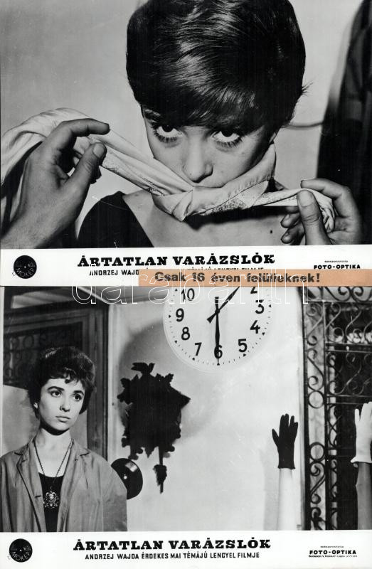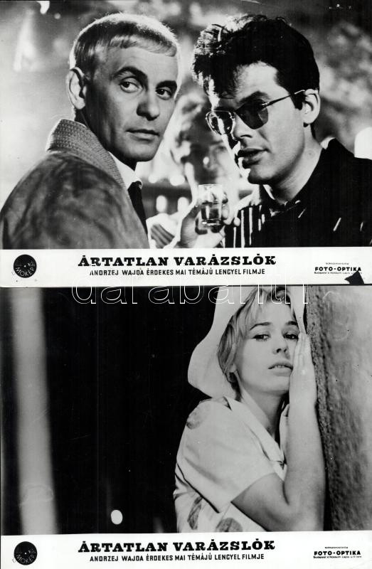 Description: cca 1959 Andrzej Wajda ,,Ártatlan varázslók" című lengyel filmjének jelenetei és szereplői, 19 db vintage produkciós filmfotó ezüst zselatinos fotópapíron, a használatból eredő (esetleges) kisebb hibákkal, 18x24 cm