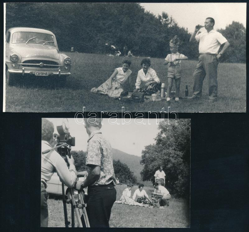 cca 1960 Reklámforgatás Skoda autóval, 2 db fotó, 12x9 cm és 19,5x9 cm