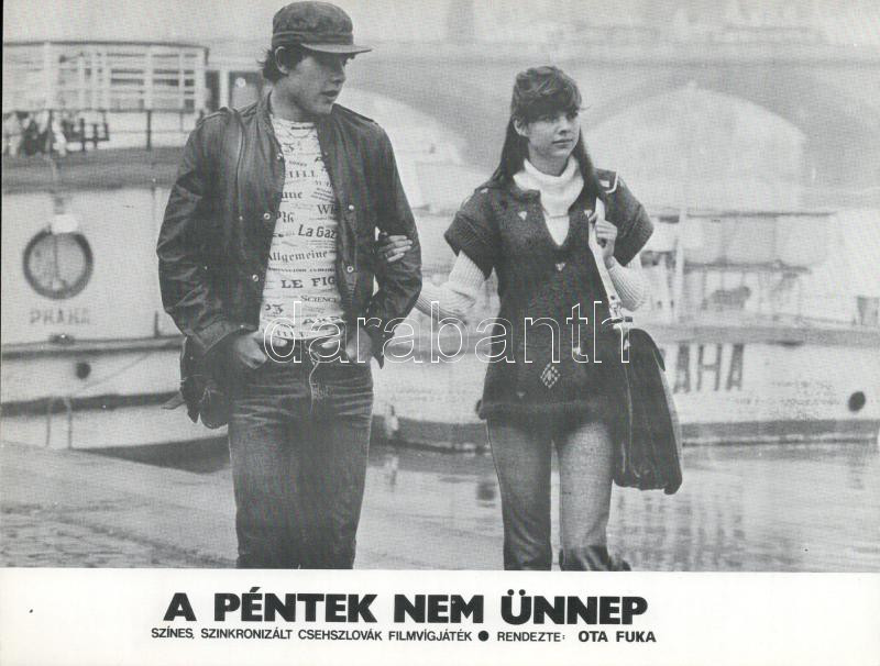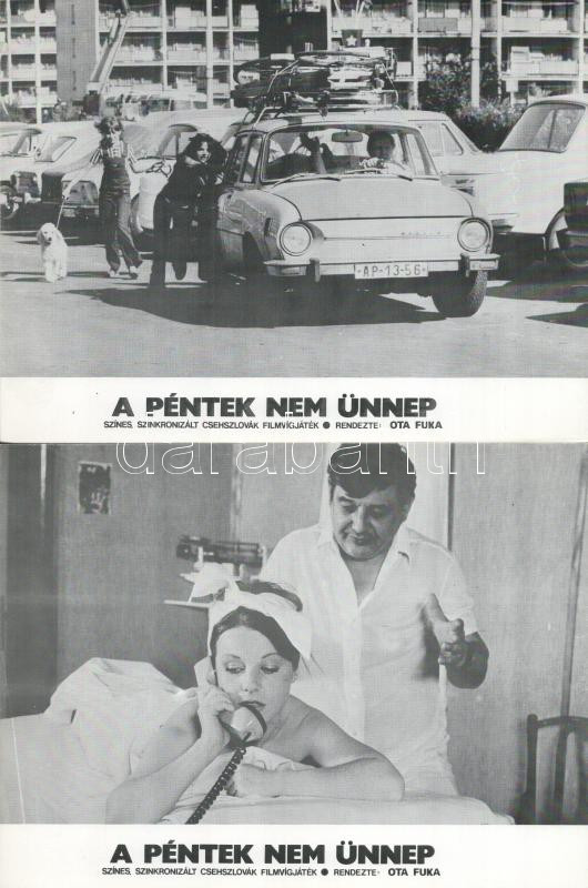 Description: cca 1979 ,,A péntek nem ünnep" című csehszlovák filmvígjáték jelenetei és szereplői, 5 db produkciós filmfotó (vitrinfotó, lobbyfotó) nyomdatechnikával sokszorosítva kartonpapírra, egyoldalas nyomással, a használatból eredő (esetleges) kisebb hibákkal, 18x24 cm