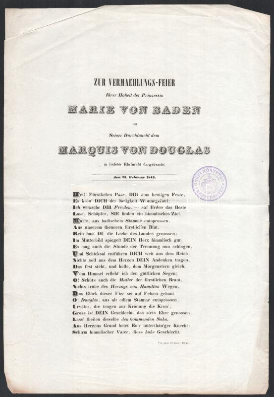 1843 Zur Vermählungs-Feier [...] Marie von Baden mit [...] Marquis von... https://www.darabanth.com/en/457-Online-auction/457.0/Art-and-other-collectibles/Printed-Materials~2000363/1843-Zur-Vermahlungs-Feier-Marie-von-Baden-mit-Marquis-von-Douglas-Lajos-Vilmos-badeni~II3057672