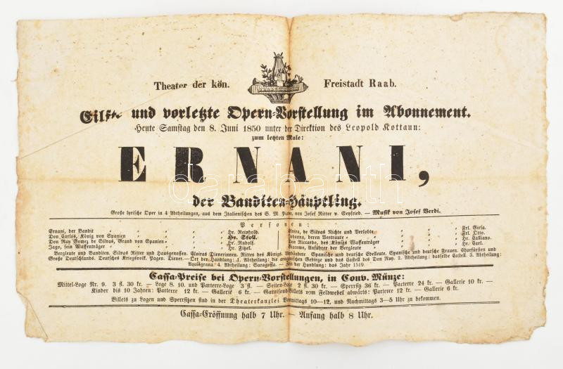 1850 Győr, a győri színházban bemutatott "Ernani, der Banditen-Häuptling" című előadás plakátja, 22×35 cm