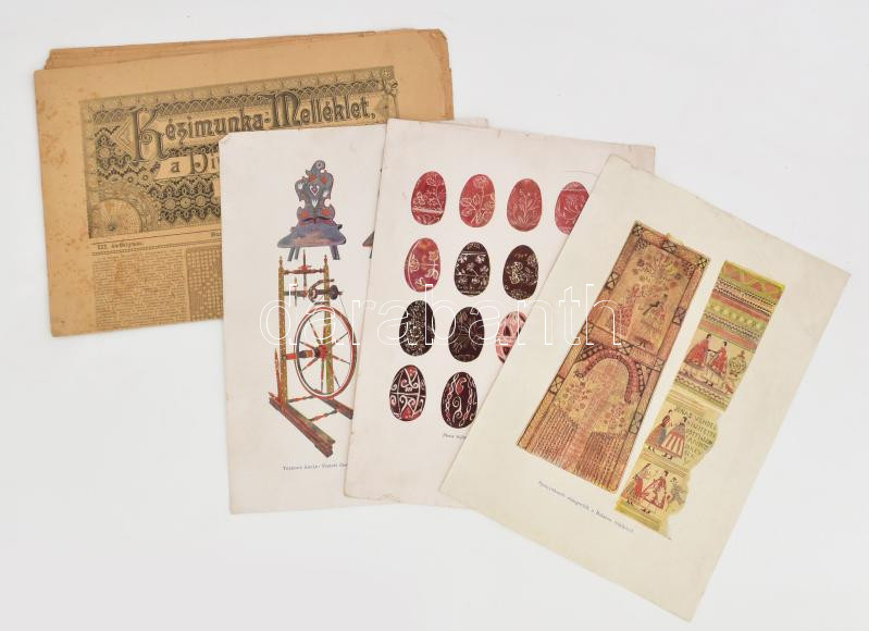 Description: 1896-1898 Kézimunka-Melléklet, a Divat Ujság külön melléklete, 3 db (III. évf. 11. és 12. sz., V. évf. 3. sz.) + 3 db színes képtábla népművészet témában (In: Malonyay Dezső: A magyar nép művészete), 29x21 cm. Változó állapotban, kisebb sérülésekkel.