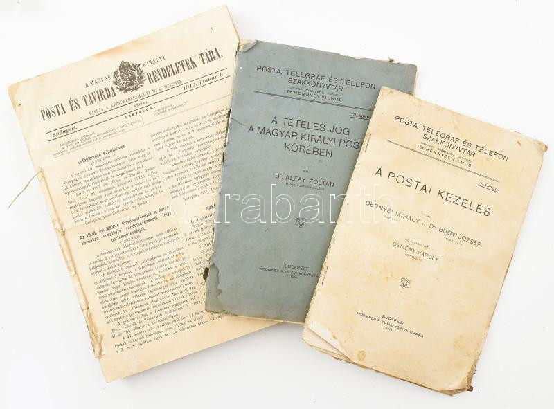 1910-1914 Postai kiadványok, 3 db: 1910 A Magyar Királyi Posta és Távirda Rendeletek Tára, 1. szám, 1910. január 6. + 1914 Dernyei Mihály - Bugyi József: A postai kezelés. Posta, Telegráf és Telefon Szakkönyvtár 8. könyv. + 1914 Dr. Alfay Zoltán: A tételes jog a Magyar Királyi Posta körében. Posta, Telegráf és Telefon Szakkönyvtár 13. könyv. Változó, sérült állapotban.
