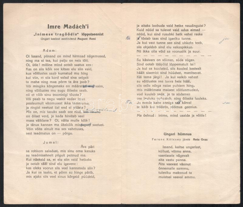 Description: 1924 Madách Imre születésének 100 évfordulós ünnepségének eszperantó nyelvű nyomtatványa rajta Himnusz eszperantó nyelvű szövegével. 4 p néhány rájegyzéssel