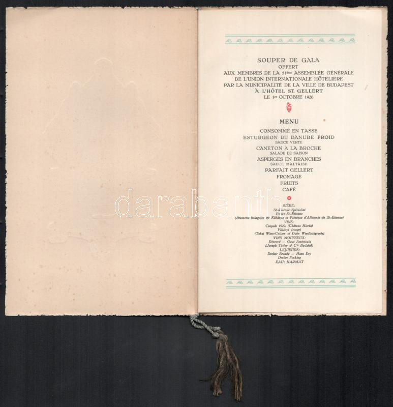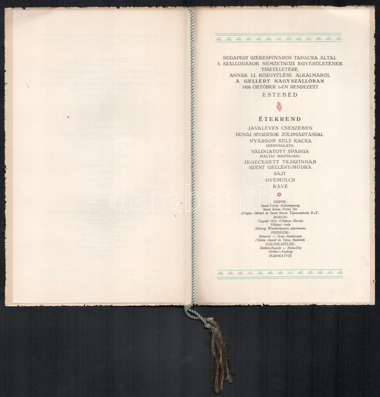 1926 Budapest Székesfőváros Tanácsa által a Szállodások nemzetközi Egyesületének tiszteletére rendezett estebéd menükártyája