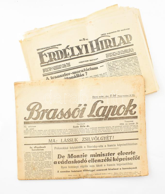 Description: 1933-34 2 db erdélyi újság: Brassói Lapok, 1934. január 21., vasárnapi melléklettel és Erdélyi Hírlap, 1933. aug. 20. Mindkettő kissé foltos és kisebb sérülésekkel.