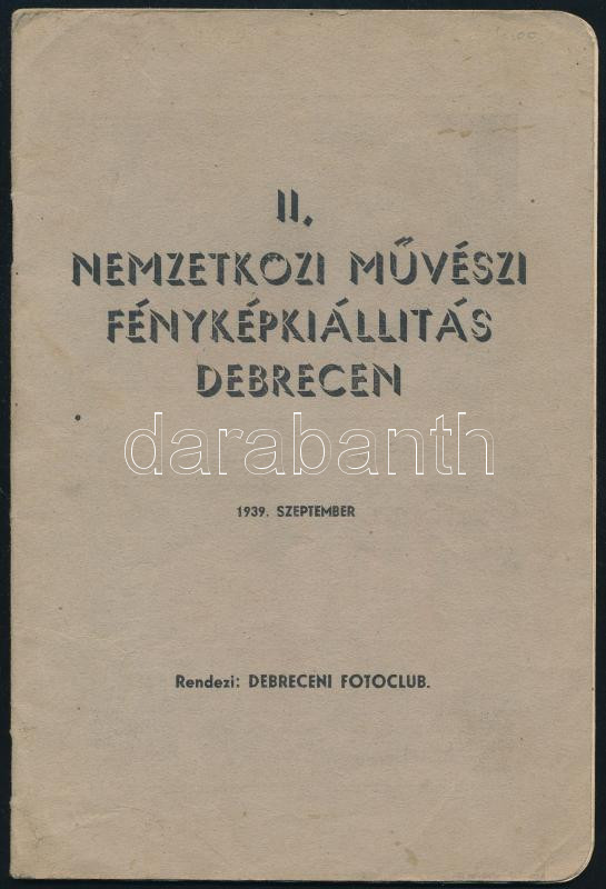 1939 II. Nemzetközi művészi fényképkiállítás Debrecen. 1939. szeptember. Debrecen, 1939, Debreceni Fotoclub, (Lehotai-ny.), 16 p. Benne fekete-fehér fotókkal, közte Angyalfi Andor, Vadas Ernő fotóival. Benne nemzetközi és magyar fotósok neveivel, közte Angyalfi Andor, Aszmann Ferenc, Csörgeő Tibor, Vadas Ernő és mások. Kiadói papírkötés,
