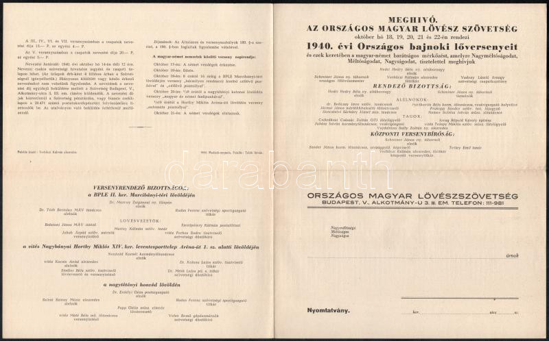 Description: 1940 Meghívó az Országos Magyar Lövész Szövetség (OMLSZ) 1940. évi országos bajnoki lőversenyeire, benne a rendezők névsora és a részvételi feltételek, jó állapotban, 42x26 cm