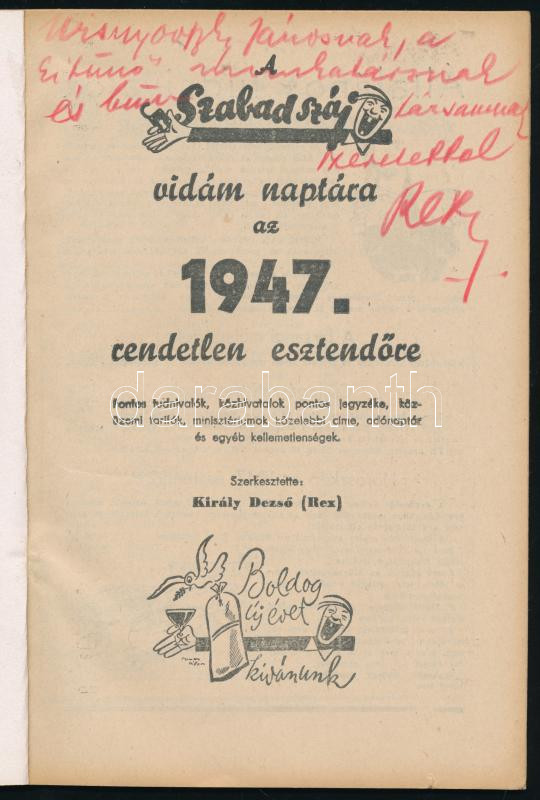 Description: 1947 Szabad száj vidám naptára az 1947. rendetlen esztendőre. Szerk.: Király Dezső (Rex). Bp., Hungária Hírlapnyomda Rt., 56 p. Kiadói tűzött papírkötés. Király Dezső 'Rex' (1896-1966) újságíró, humorista, a Szabad Száj szerkesztője által DEDIKÁLT.