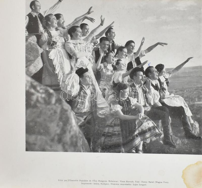 Description: 1955 L'Ensemble Populaire de Chant et de Danse de l'État Hongrois. Das Ungarische Staatliche Volksensemble. / A Magyar Állami Népi Együttest bemutató prospektus, fekete-fehér képekkel illusztrálva, francia és német nyelven. Bp., Szikra-ny., 12 sztl. lev. Kiadói tűzött papírkötés, kissé viseltes, foltos állapotban.