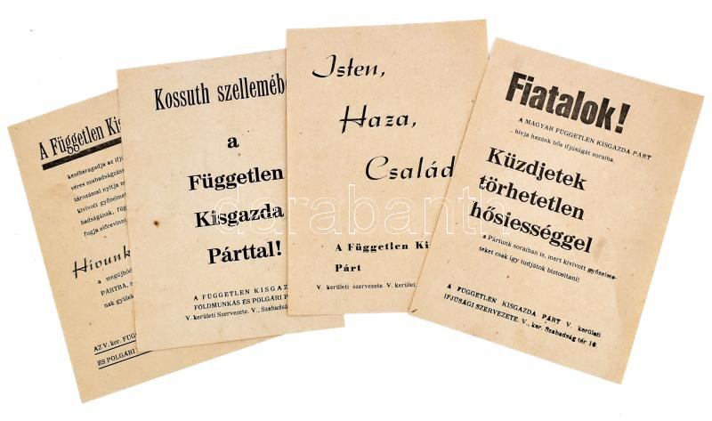 https://www.darabanth.com/en/457-Online-auction/457.0/Art-and-other-collectibles/Printed-Materials~2000363/1956-A-Fuggetlen-Kisgazdapart-FKgP-4-db-kulonbozo-roplapja-jo-allapotban-21x15-cm~II3060984