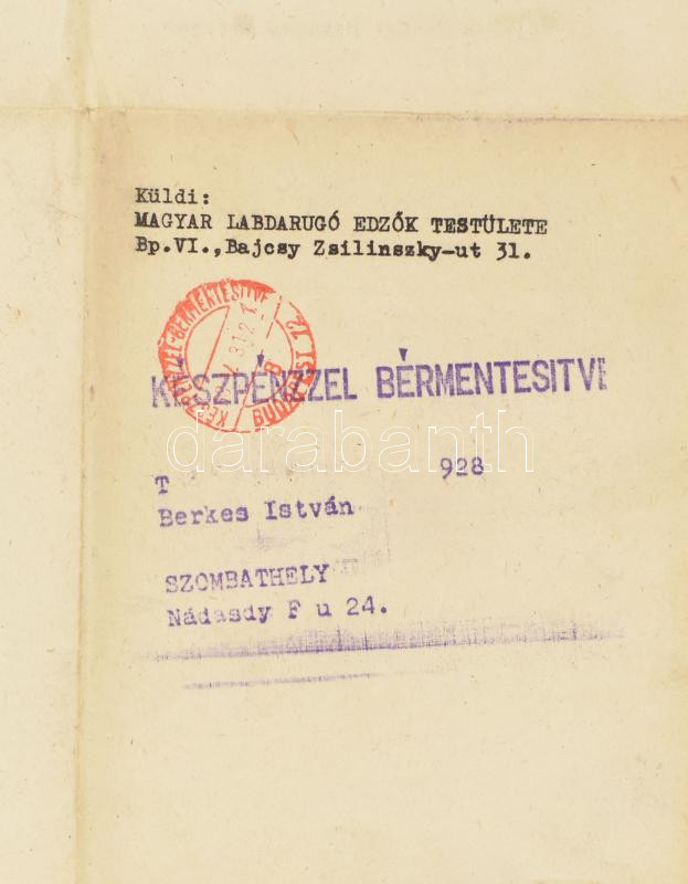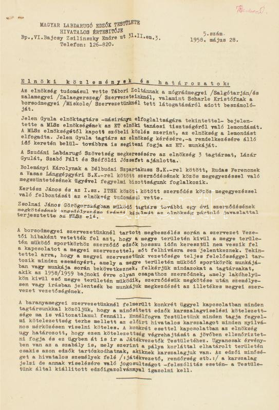1958 Magyar Labdarugó EdzÅ‘k Testülete hivatalos értesÃtÅ‘je 5. szám, 1958. máj. 28. (postai úton terjesztett, belsÅ‘ kiadvány), Berkes István (feltehetÅ‘leg Berkes István (1950-) labdarúgó, orvos, sportorvos édesapja) részére cÃmezve és küldve, 5+(1) p.